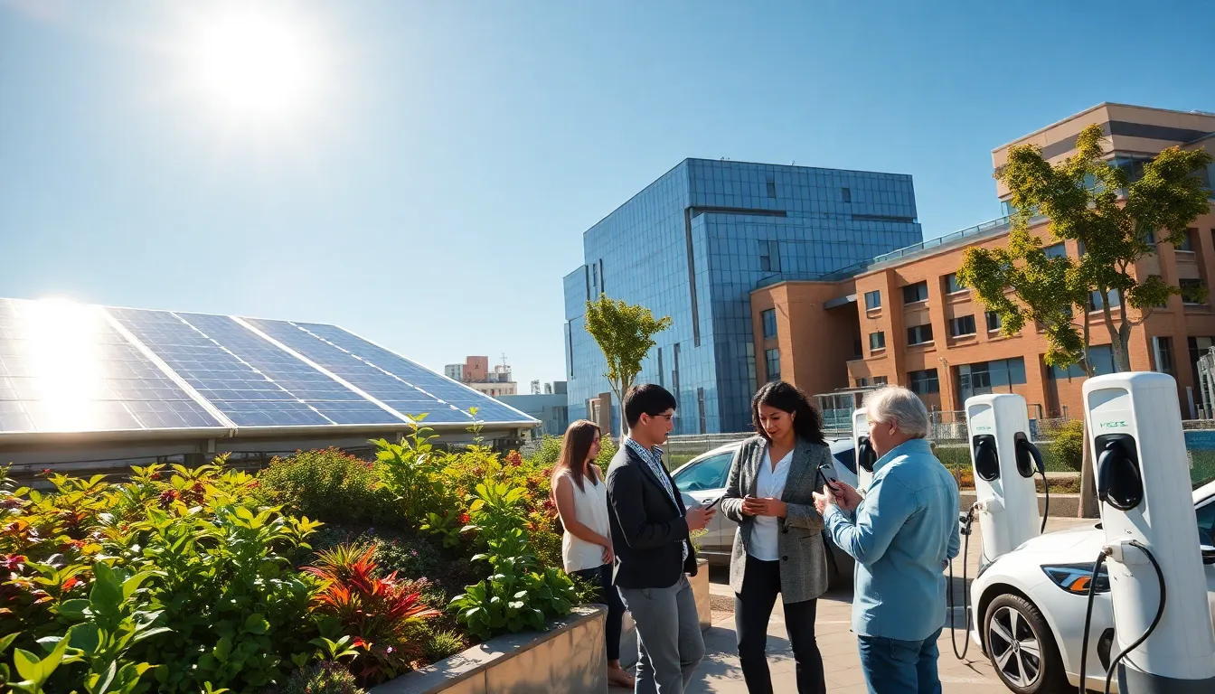 diverse team discussing renewable energy solutions in a modern neighborhood.